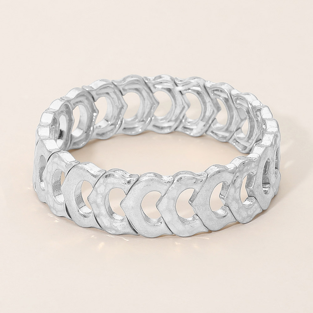 • Bold stretch bracelet featuring repeating links that create a sculptural, modern look. Designed with a flexible slip-on fit for comfort and easy wear. Perfect for stacking or wearing solo, this statement bracelet adds texture, movement, and contemporary edge to everyday outfits or elevated styling.