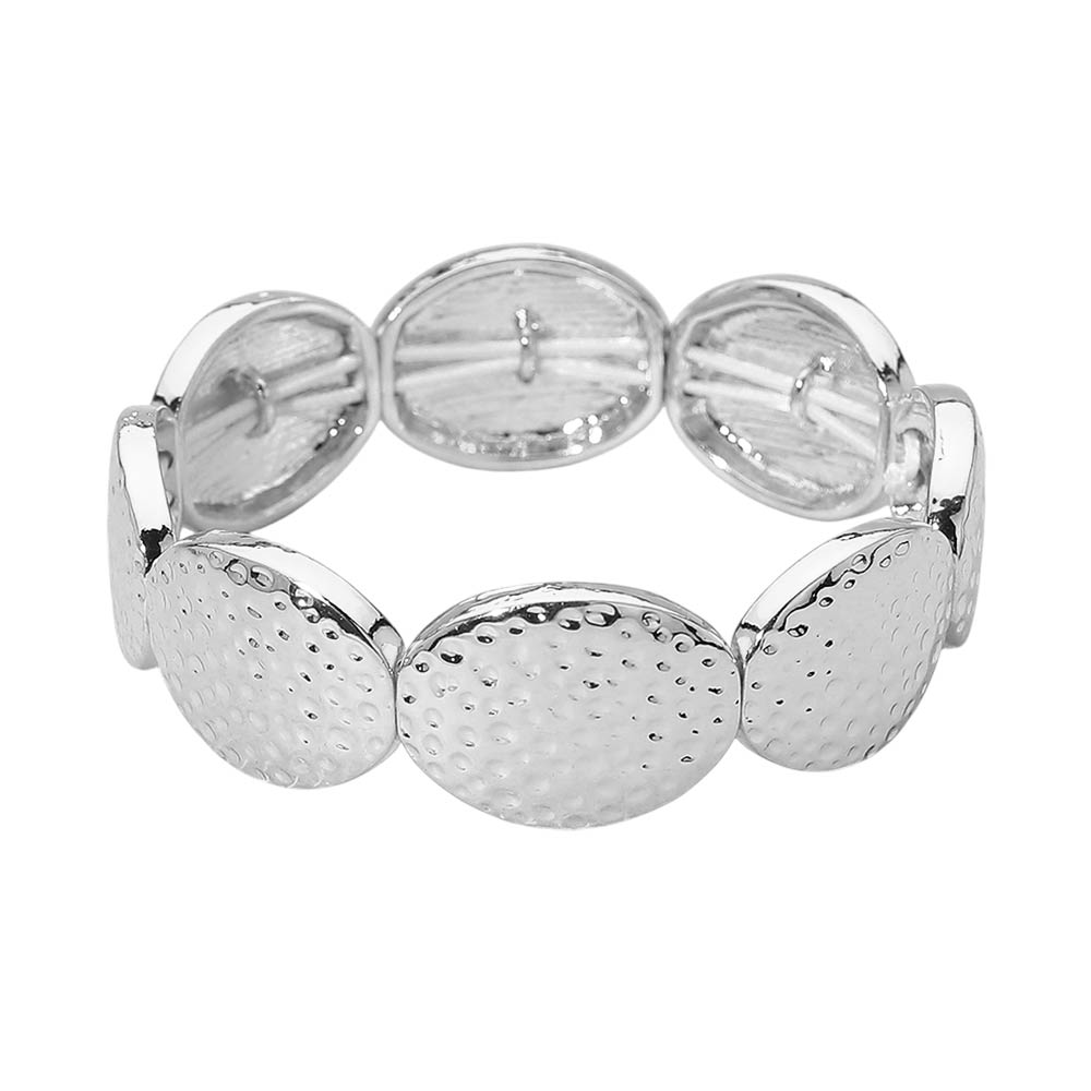 Details • Size : 0.75" H • Stretchable • This hammered oval stretch bracelet features softly textured oval links that add dimension and visual interest to a classic silhouette. Designed with a comfortable stretch fit, it offers easy wear and a refined statement look. Ideal for everyday styling, layering, boutique assortments, and gift-ready jewelry collections. • Lead and Nickel Compliant