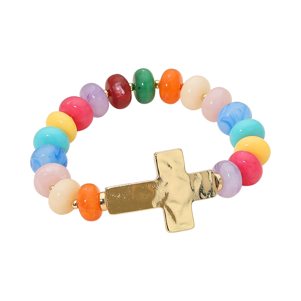 Details • Size : 1" H • Stretchable • Colorful beaded stretch bracelet featuring glossy round beads and a bold cross charm centerpiece. Comfortable and stylish, this bracelet makes a meaningful accessory for everyday wear or as a thoughtful gift. • Lead and Nickel Compliant