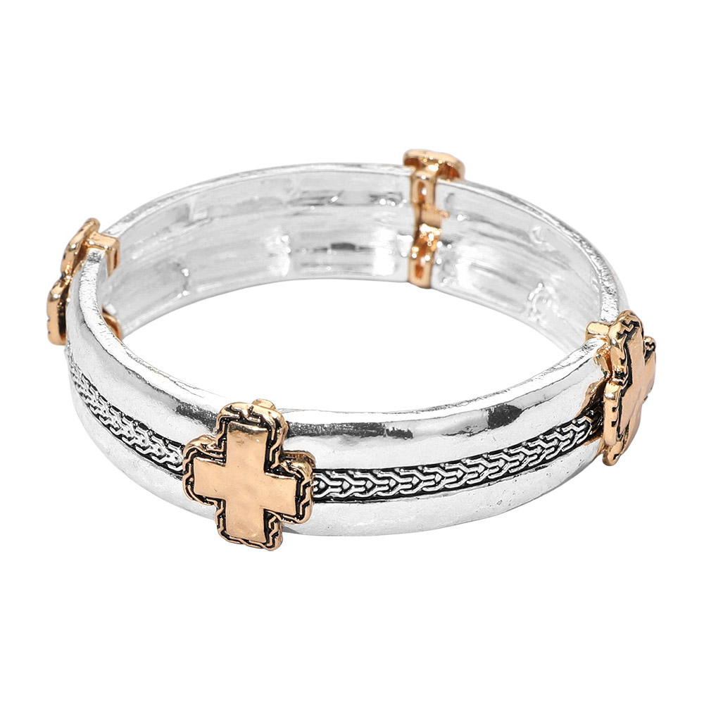 Details • Size : 0.75" H, 2.25" D • Stretchable • Statement bracelet featuring raised cross accents and a structured silhouette for a bold, timeless look. Designed to add character and dimension to everyday or occasion styling, this piece offers comfortable wear with strong visual impact and classic appeal. • Lead and Nickel Compliant