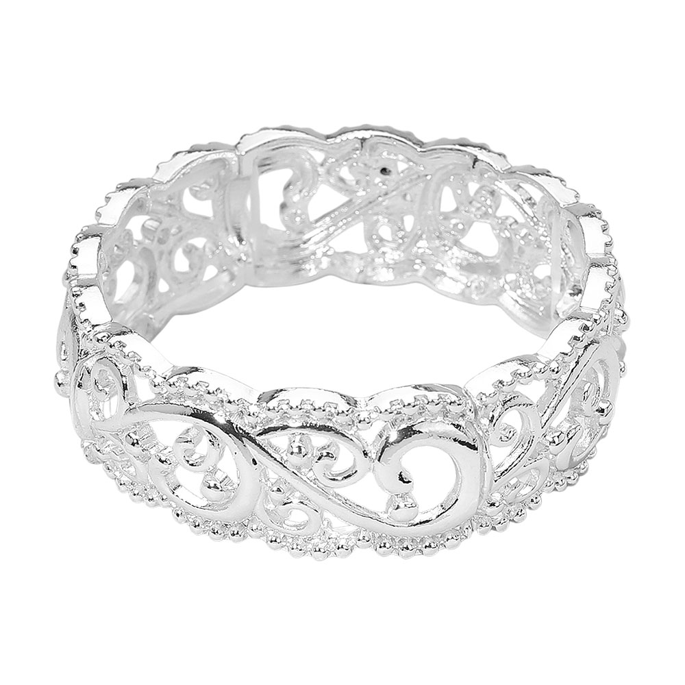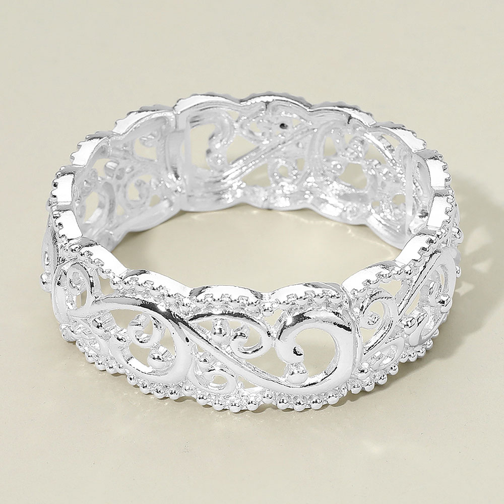 Details • Size : 0.8" H, 2.3" D • Stretchable • This elegant bangle features intricate filigree scrollwork and a delicate openwork design, creating a timeless and graceful look. Perfect for adding a refined touch to any ensemble, it balances sophistication and artistry for effortlessly elevated style. • Lead and Nickel Compliant