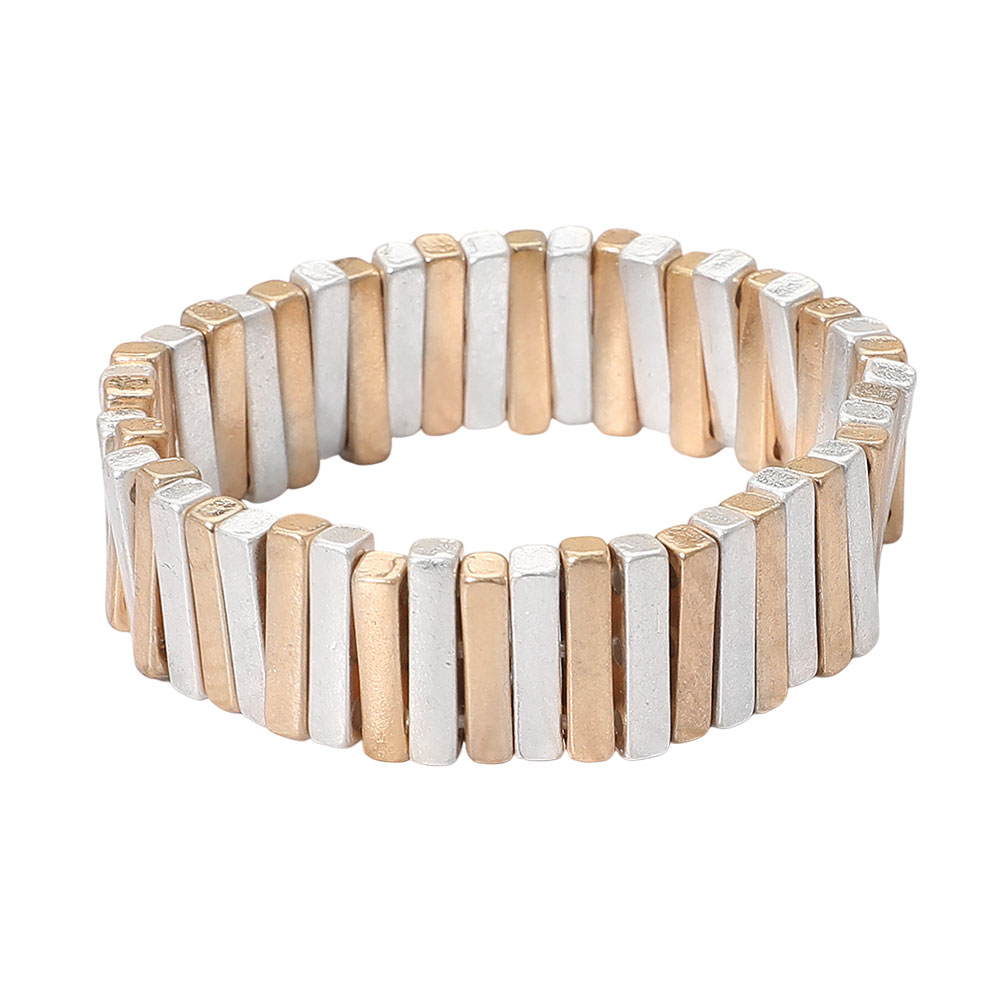 • Textured stretch bracelet crafted with rectangular beads in a mixed rustic finish. Designed with a multi-tone pattern that adds dimension and style. Comfortable, easy-wear fit perfect for stacking or wearing alone. A bold accessory with artisanal charm.
