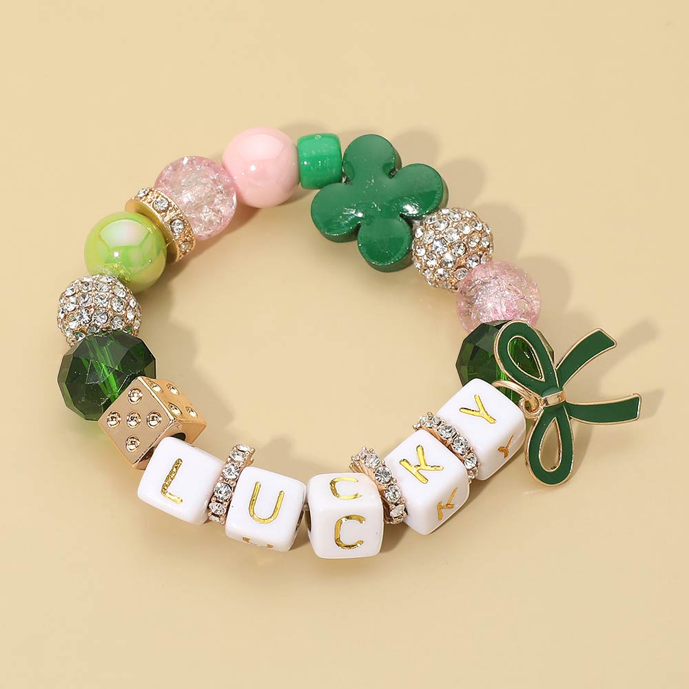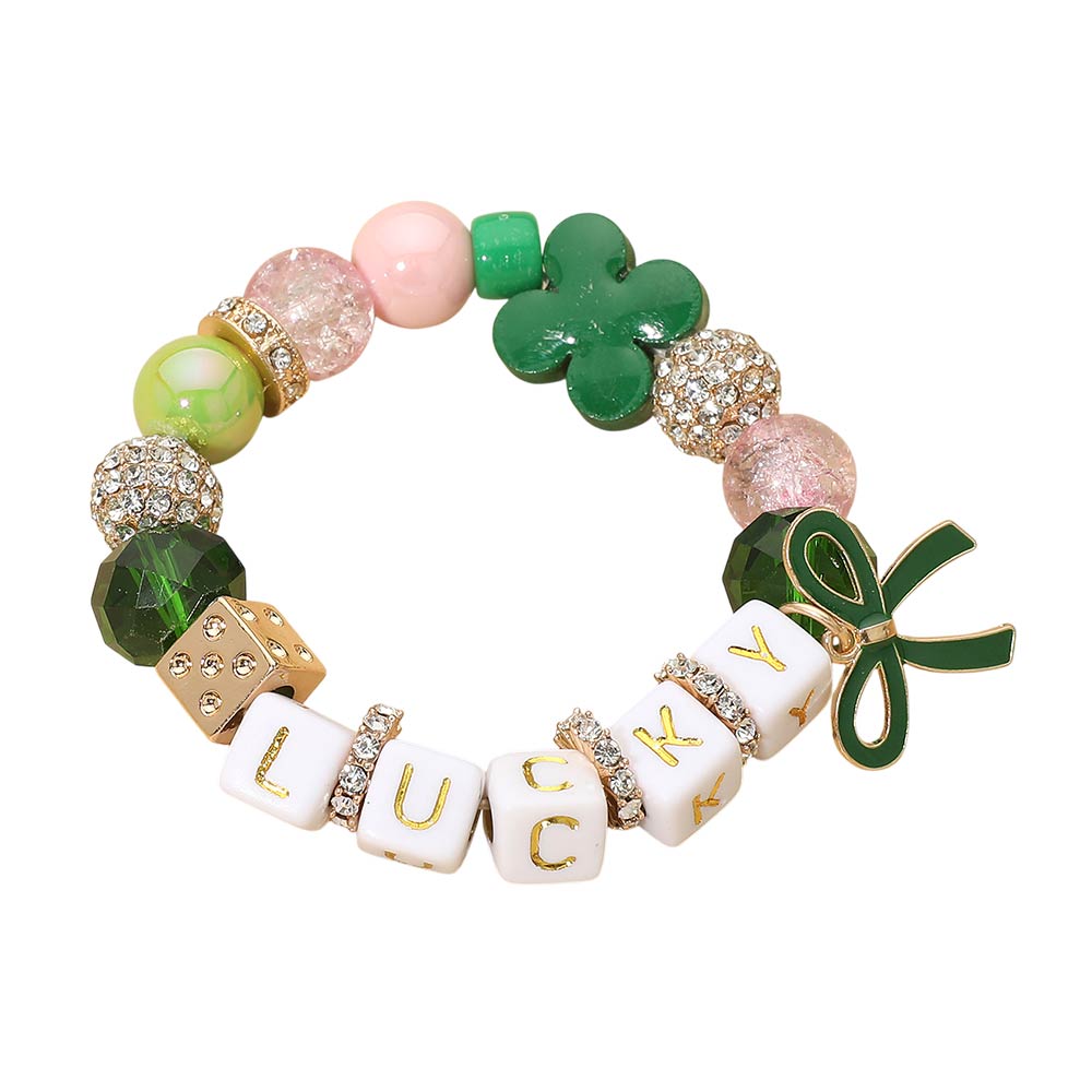 Details • Size : 0.7" H • Stretchable • Playful lucky charm stretch bracelet featuring mixed decorative beads, letter accents spelling a cheerful message, and symbolic clover and bow details. Designed for easy wear and standout appeal, it’s a fun accessory for seasonal celebrations, casual outfits, gift sets, and themed collections. • Lead and Nickel Compliant