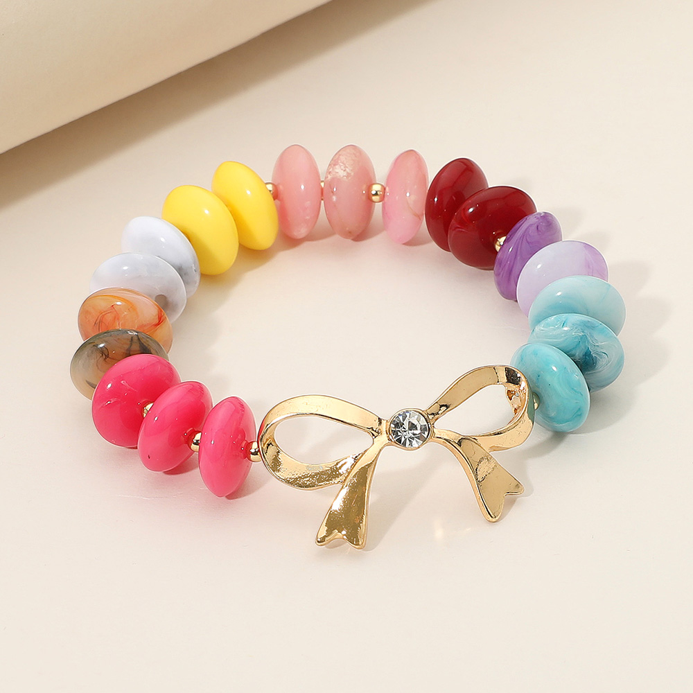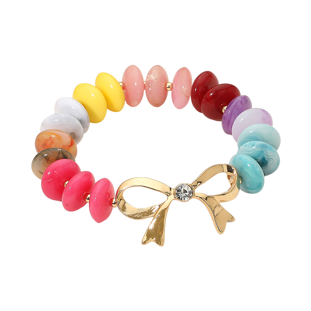 • Charming beaded stretch bracelet featuring glossy round beads in vibrant tones and a gold bow charm with crystal detail. A stylish accessory that adds a playful yet elegant touch to everyday outfits or special looks.
