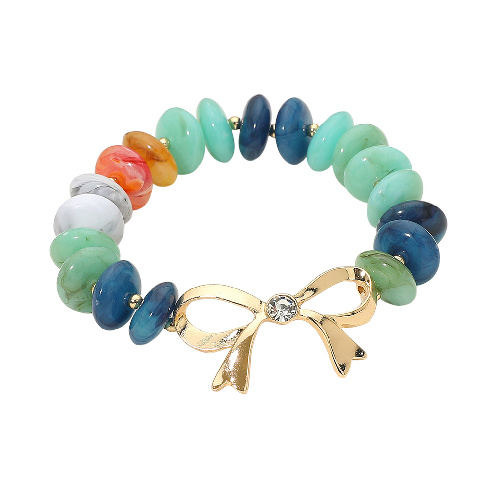 Stone Accent Metal Bow Accent Flat Resin Disc Beaded Stretch Bracelet