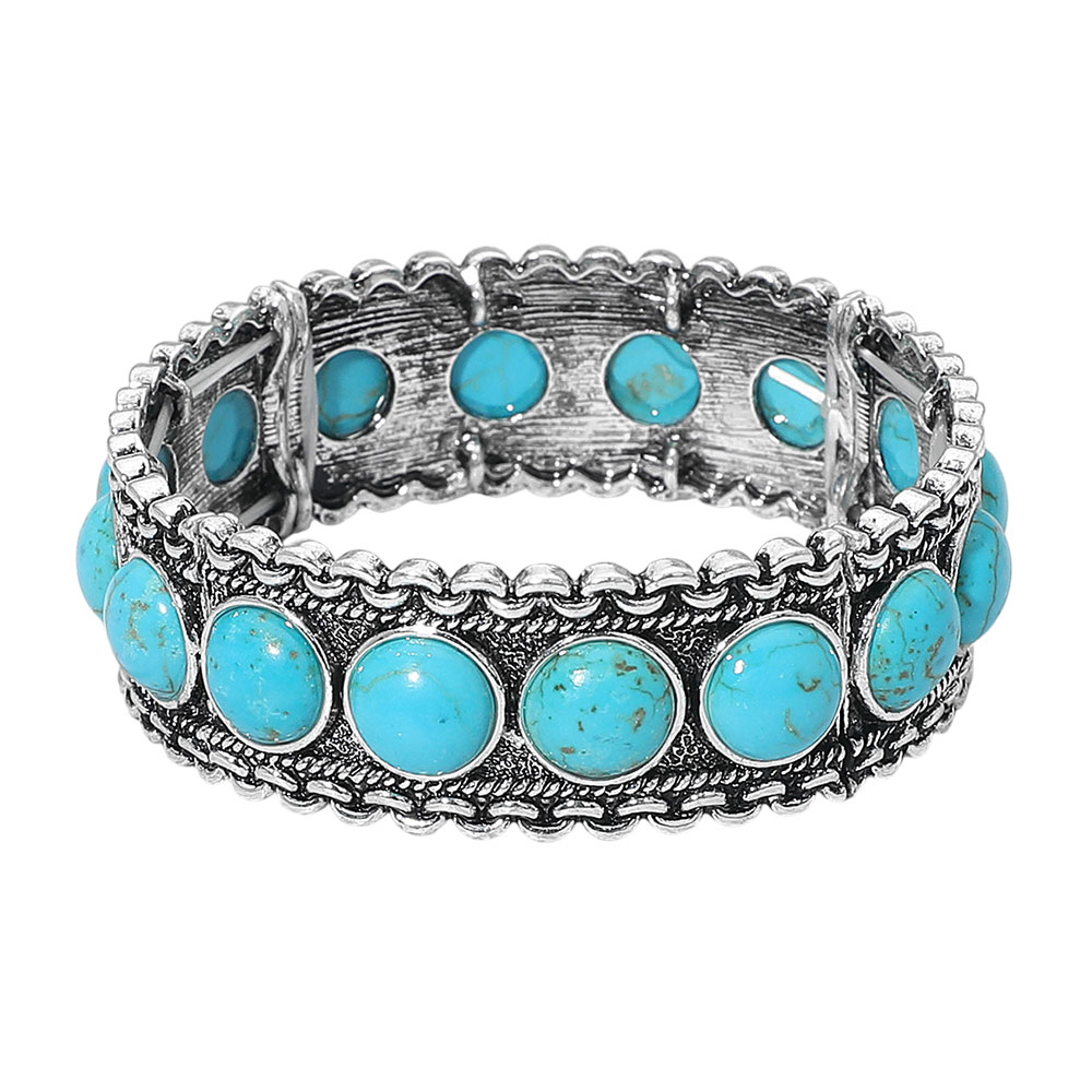 Details • Size : 0.75" H • Stretchable • Make a bold impression with this vintage-inspired stretch bracelet featuring turquoise stone accents set in an ornate metal design. Effortlessly blending classic charm with modern shine, it’s the perfect accessory to elevate any outfit from casual chic to evening elegance. • Lead and Nickel Compliant