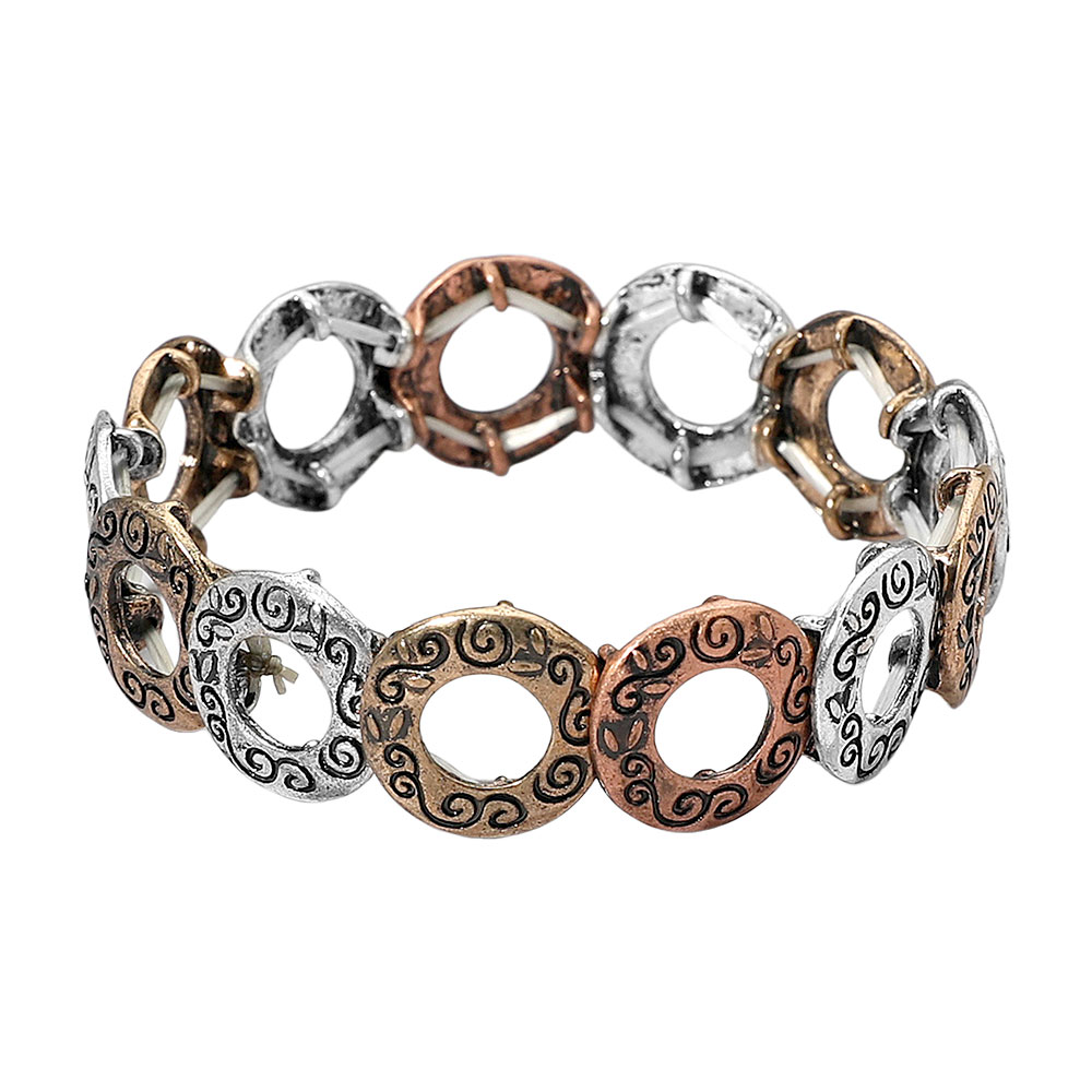 • Stylish stretch bracelet featuring engraved circle links in a mixed tone design, offering a unique blend of artistic flair and everyday wearability. Perfect for adding a touch of boho-inspired charm to layered bracelet stacks or wearing solo for a standout look.