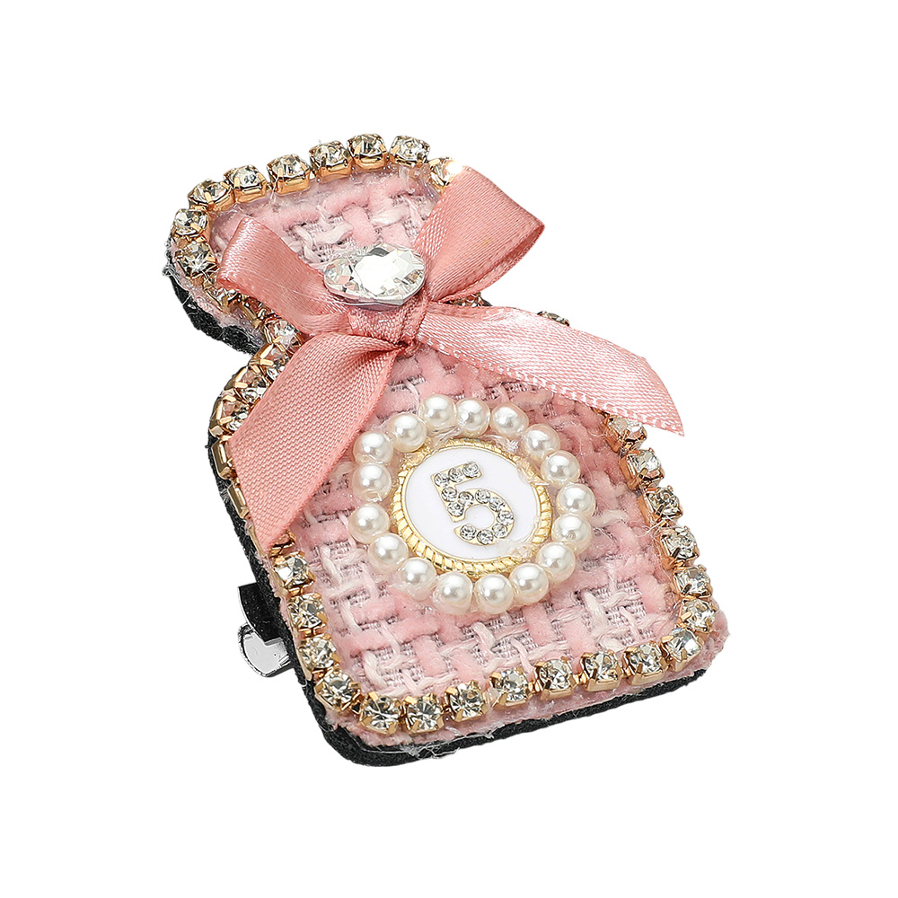 Details • Size : 1.7" X 2.5" • Dual : Pin Brooch / Hair Clip • Add charm to your hairstyle with this perfume bottle inspired hair clip featuring rhinestones, pearls, and a chic bow accent. Its elegant and versatile design makes it perfect for parties, special events, or adding a glamorous detail to your everyday look. • Lead and Nickel Compliant