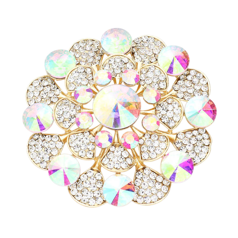 • This stunning round crystal flower brooch features layered gem accents that create a dazzling floral design. Perfect for elevating any outfit, it adds a touch of vintage-inspired glamour and refined brilliance to jackets, scarves, or formal attire.