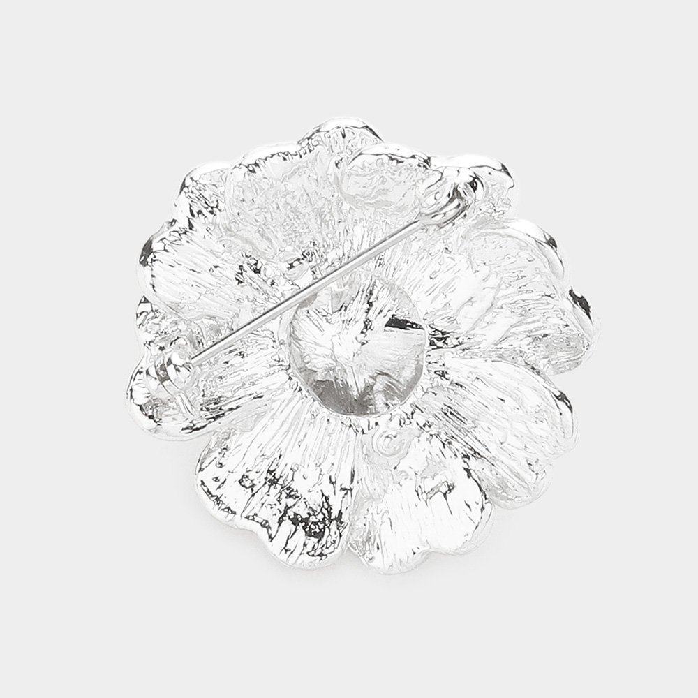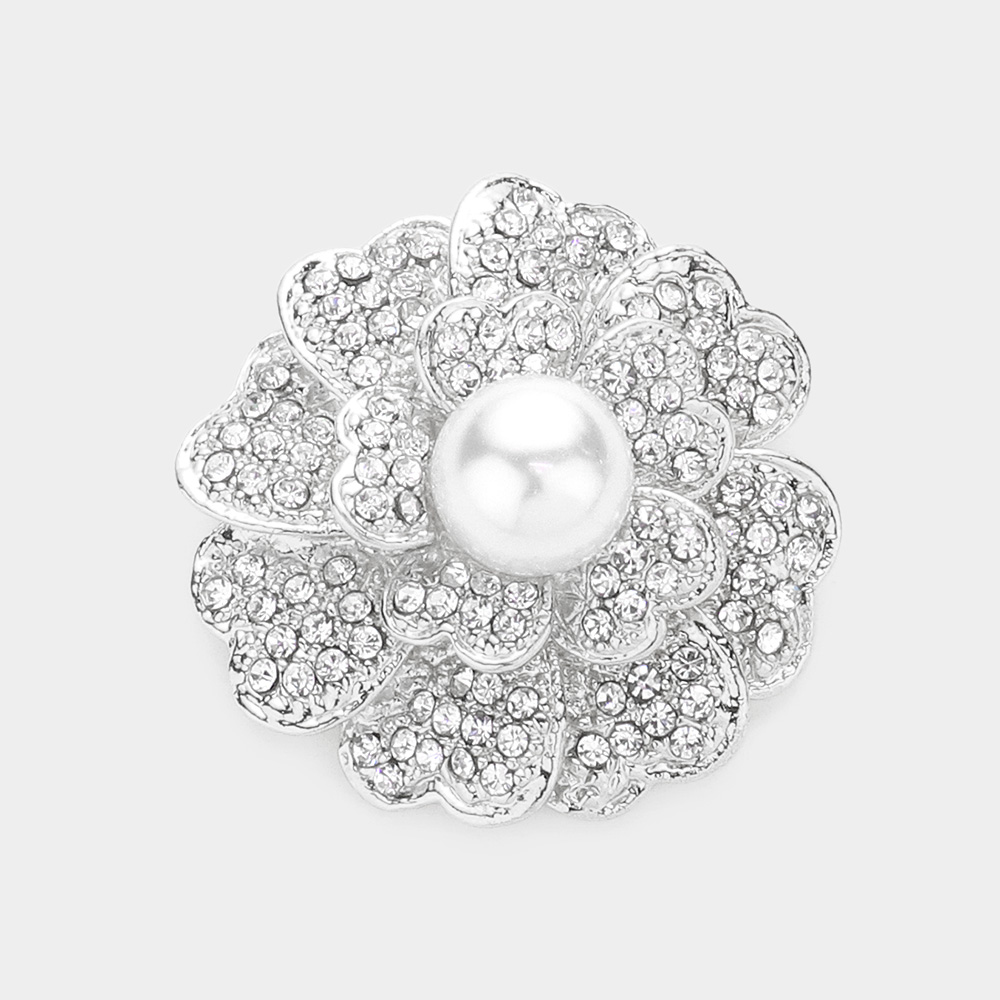 Pearl Centered Crystal Pave Flower Pin Brooch