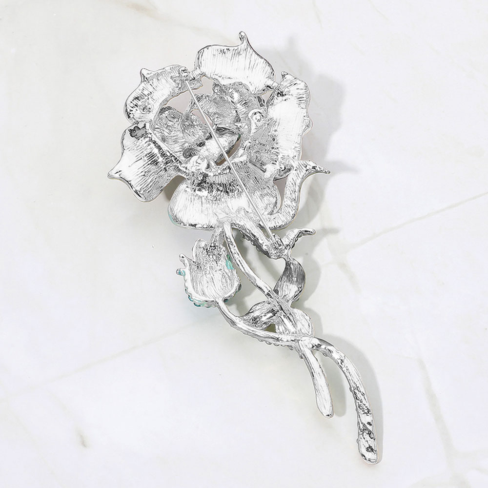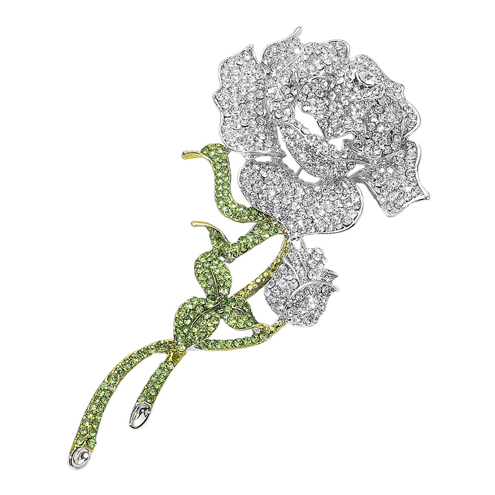 Details • Size : 2.5" X 5.5" • Pin Brooch • Chic rhinestone rose brooch featuring a detailed floral silhouette with shimmering stones on the petals, stem, and leaves. Perfect for accessorizing jackets, dresses, scarves, or bags with a refined and eye-catching statement touch. • Lead and Nickel Compliant