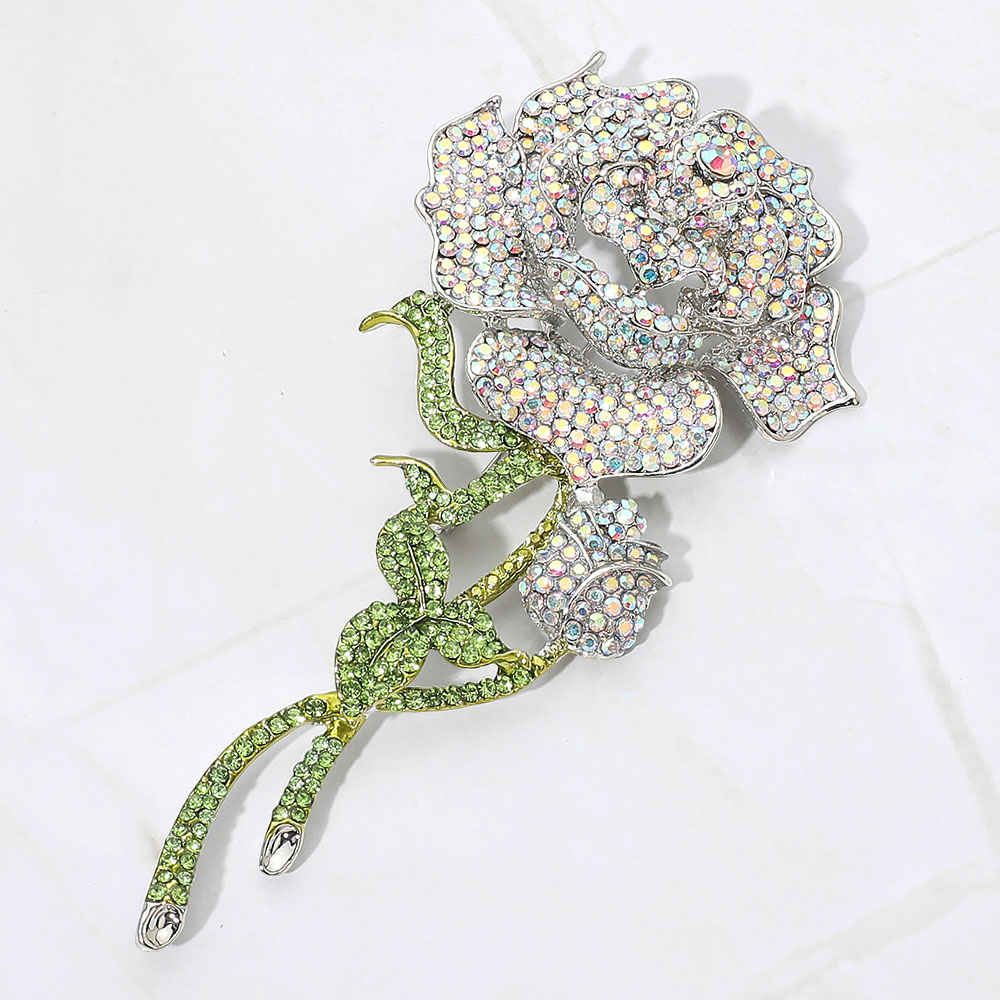 • Chic rhinestone rose brooch featuring a detailed floral silhouette with shimmering stones on the petals, stem, and leaves. Perfect for accessorizing jackets, dresses, scarves, or bags with a refined and eye-catching statement touch.