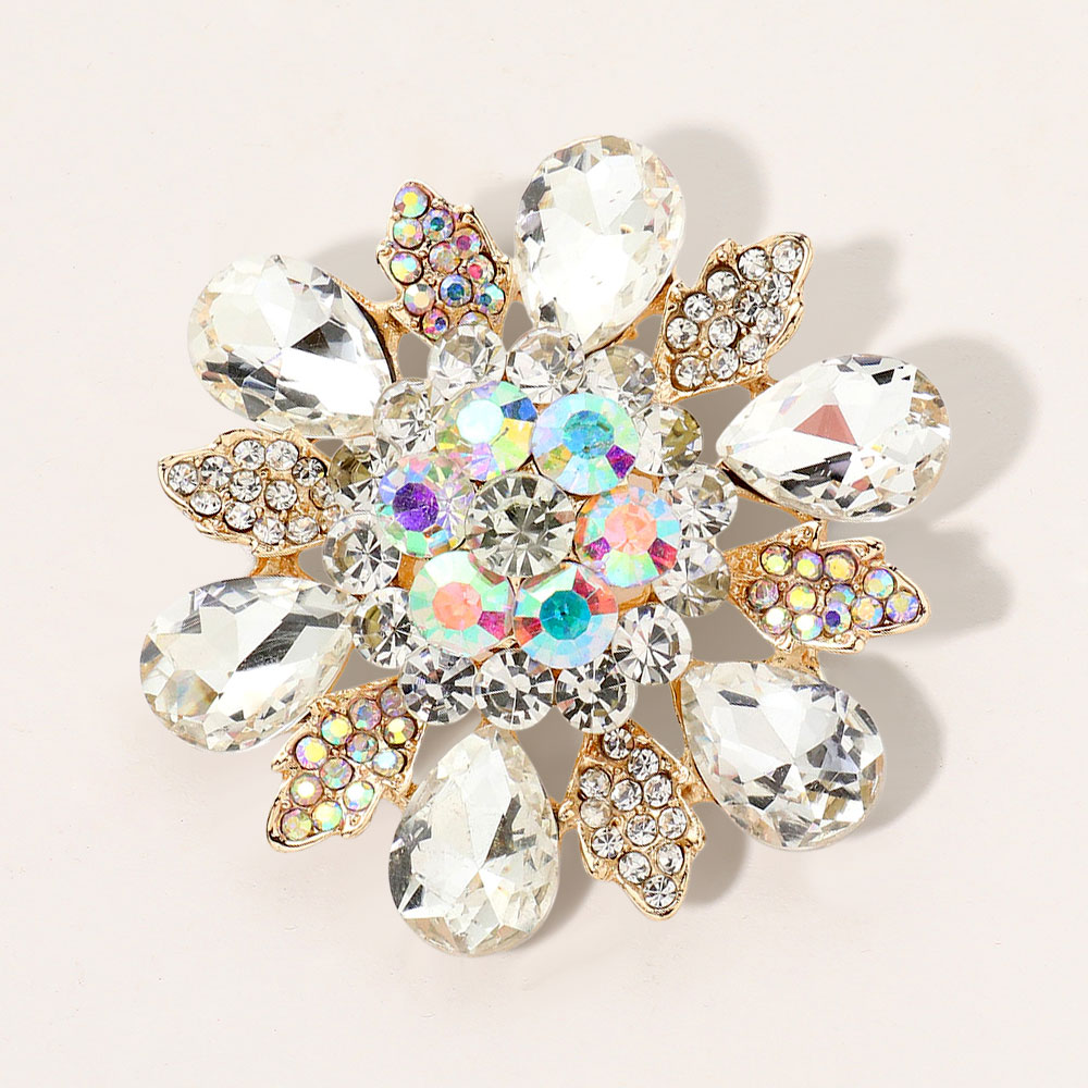 Details • Size : 2.5" x 2.5" • Pin Brooch • This elegant crystal flower brooch adds a radiant touch to any outfit with its beautifully arranged sparkling stones and refined floral silhouette. Perfect for elevating everyday looks or enhancing formal attire, it offers timeless charm and eye-catching brilliance. • Lead and Nickel Compliant