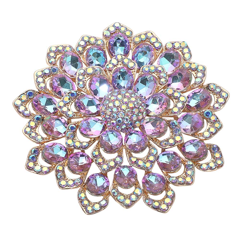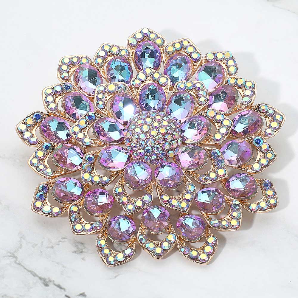 Details • Size : 3.1" X 3.1" • Pin Brooch • Stunning floral brooch designed with layered petals and iridescent crystal gemstones. Perfect as a statement accessory for dresses, scarves, shawls, or special occasions, adding sparkle and elegance to any outfit. • Lead and Nickel Compliant