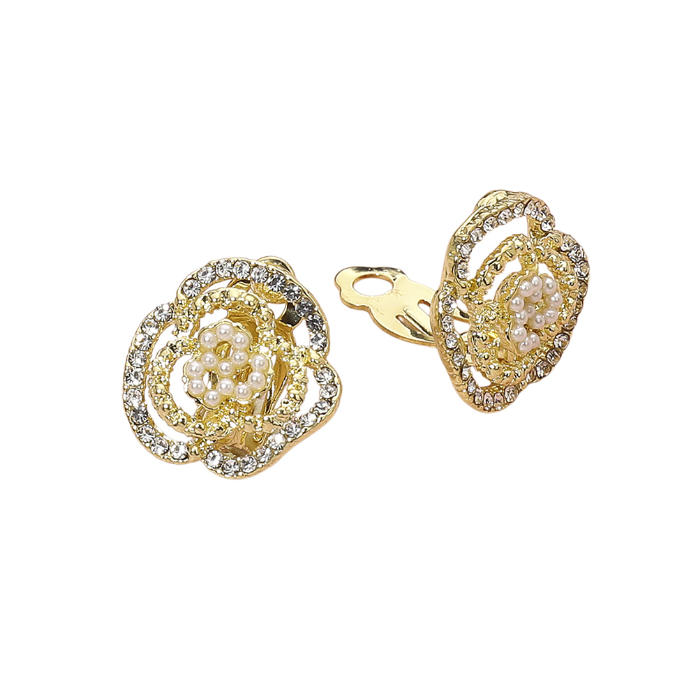 Details • Size : 0.75" X 0.75" • Clip On • Add timeless charm to your look with these floral clip-on earrings featuring a central cluster of pearls surrounded by shimmering crystal-lined petals. Their elegant, vintage-inspired design offers effortless glamour and comfortable wear for any occasion without the need for pierced ears. • Lead and Nickel Compliant