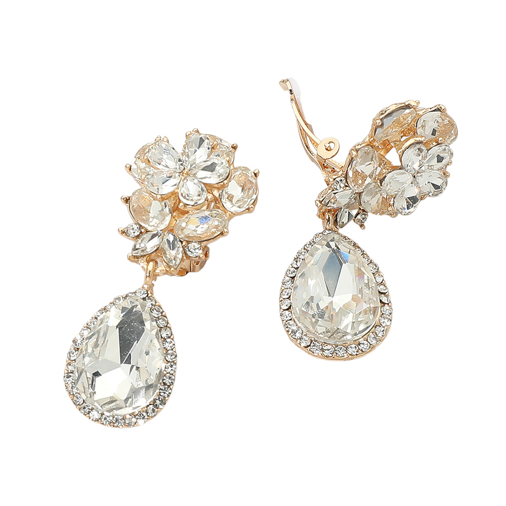 Flower Glass Crystal Teardrop Dangle Clip On Earrings