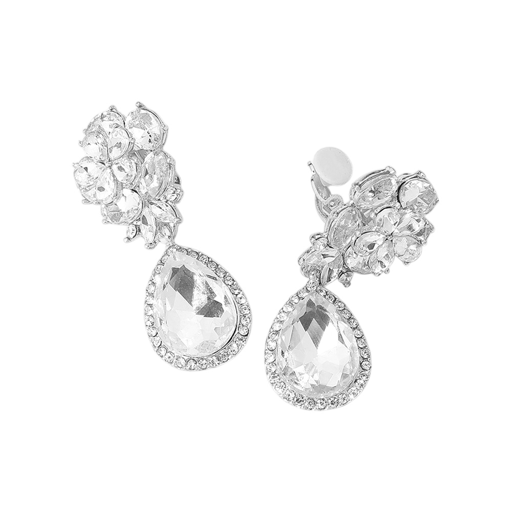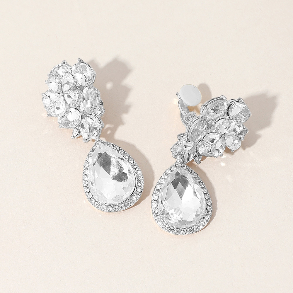 Flower Glass Crystal Teardrop Dangle Clip On Earrings