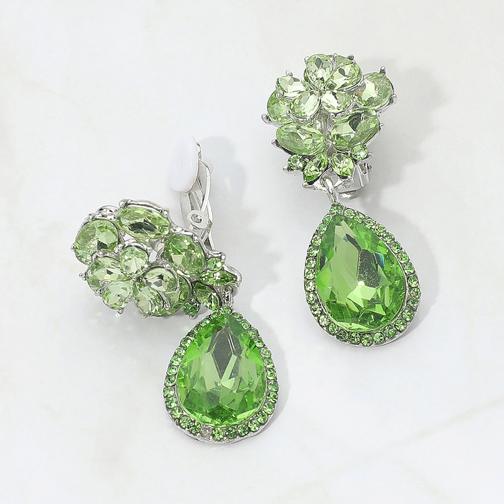 Flower Glass Crystal Teardrop Dangle Clip On Earrings