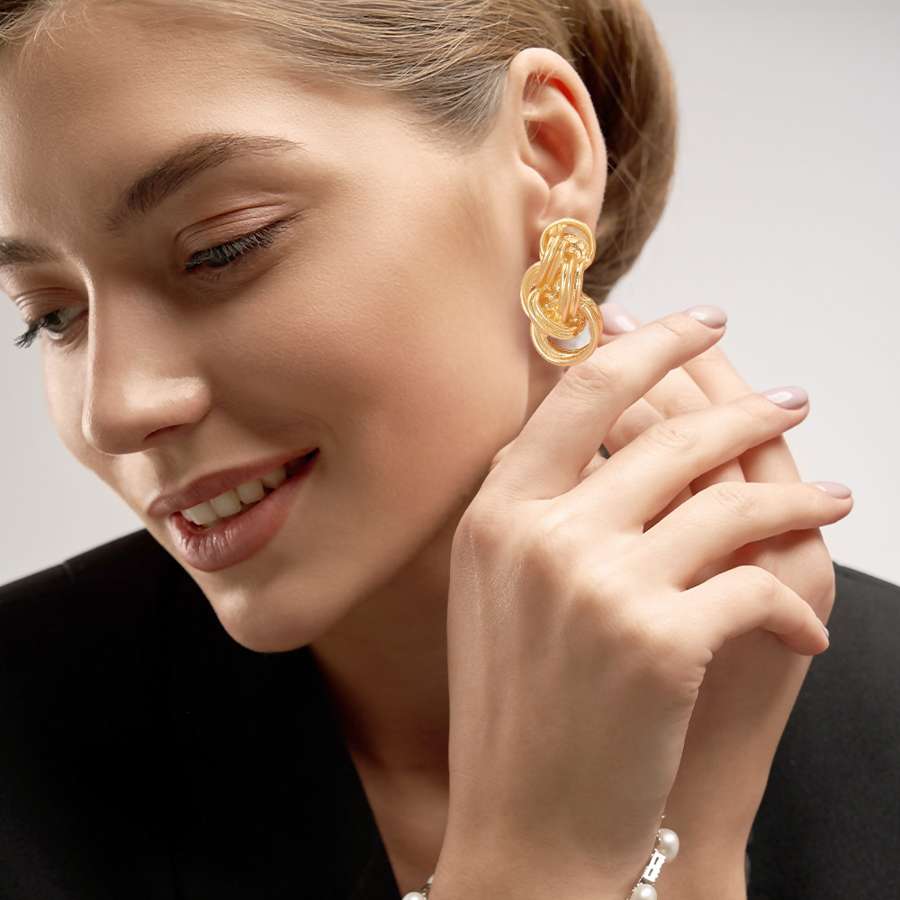 Details • Size : 0.9" X 1.3" • Clip On • These textured knot clip-on earrings blend modern artistry with timeless elegance. The intricate interwoven design adds depth and dimension, making them a chic statement piece for any occasion. Comfortable and stylish, they offer a polished finish without the need for piercings. • Lead and Nickel Compliant