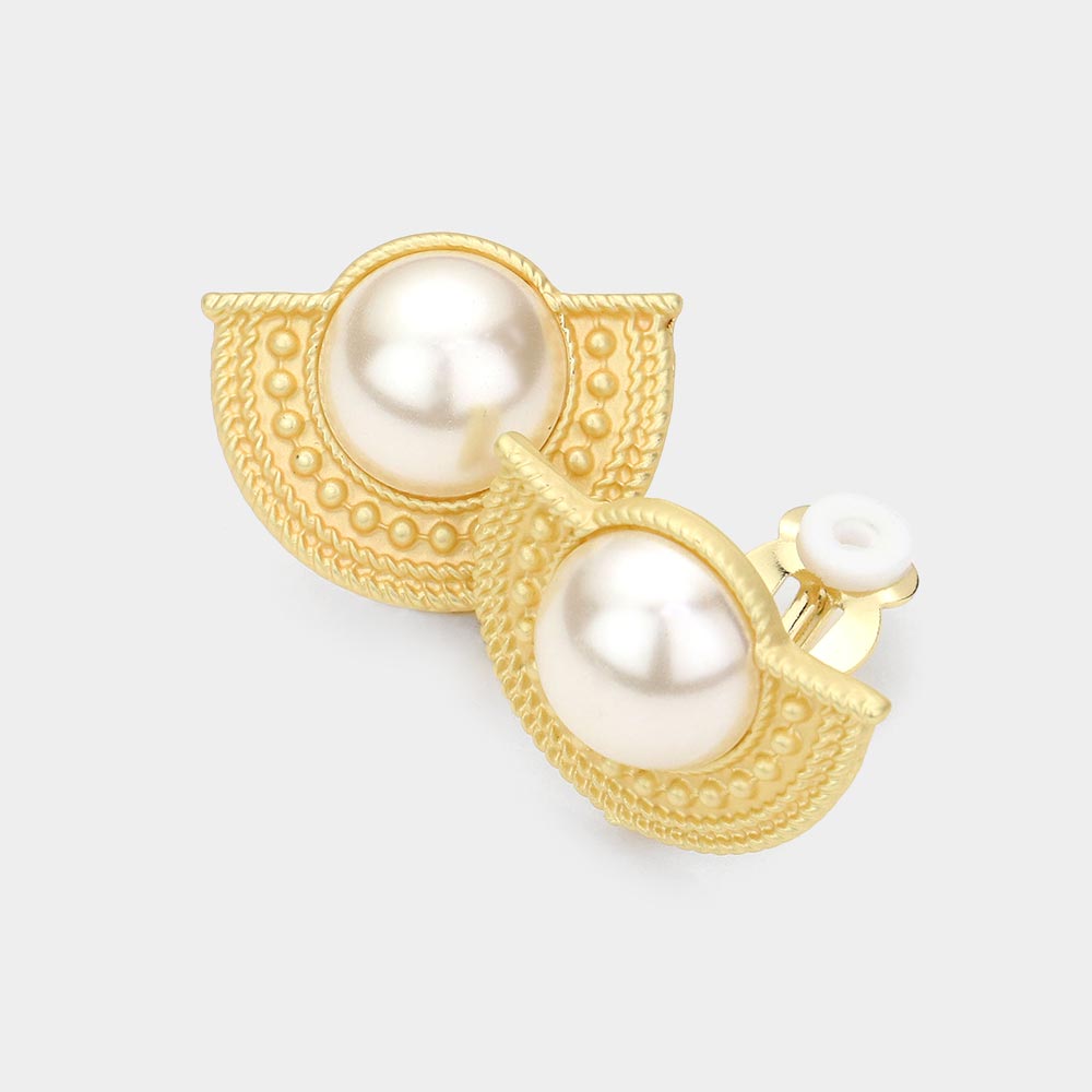 Pearl Accented Half Round Metal Clip On Earrings