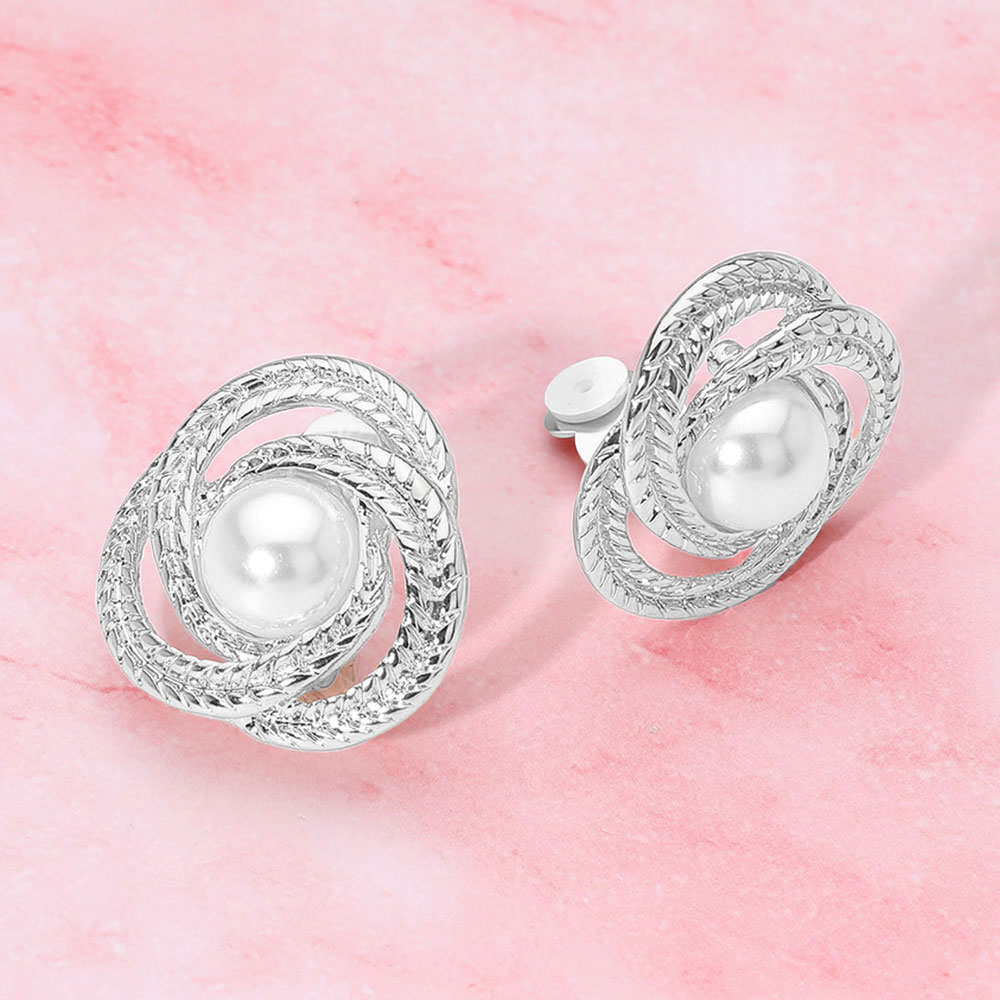 Pearl Center Textured Metal Knot Frame Clip On Earrings