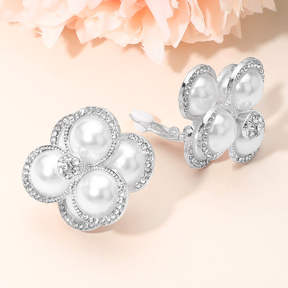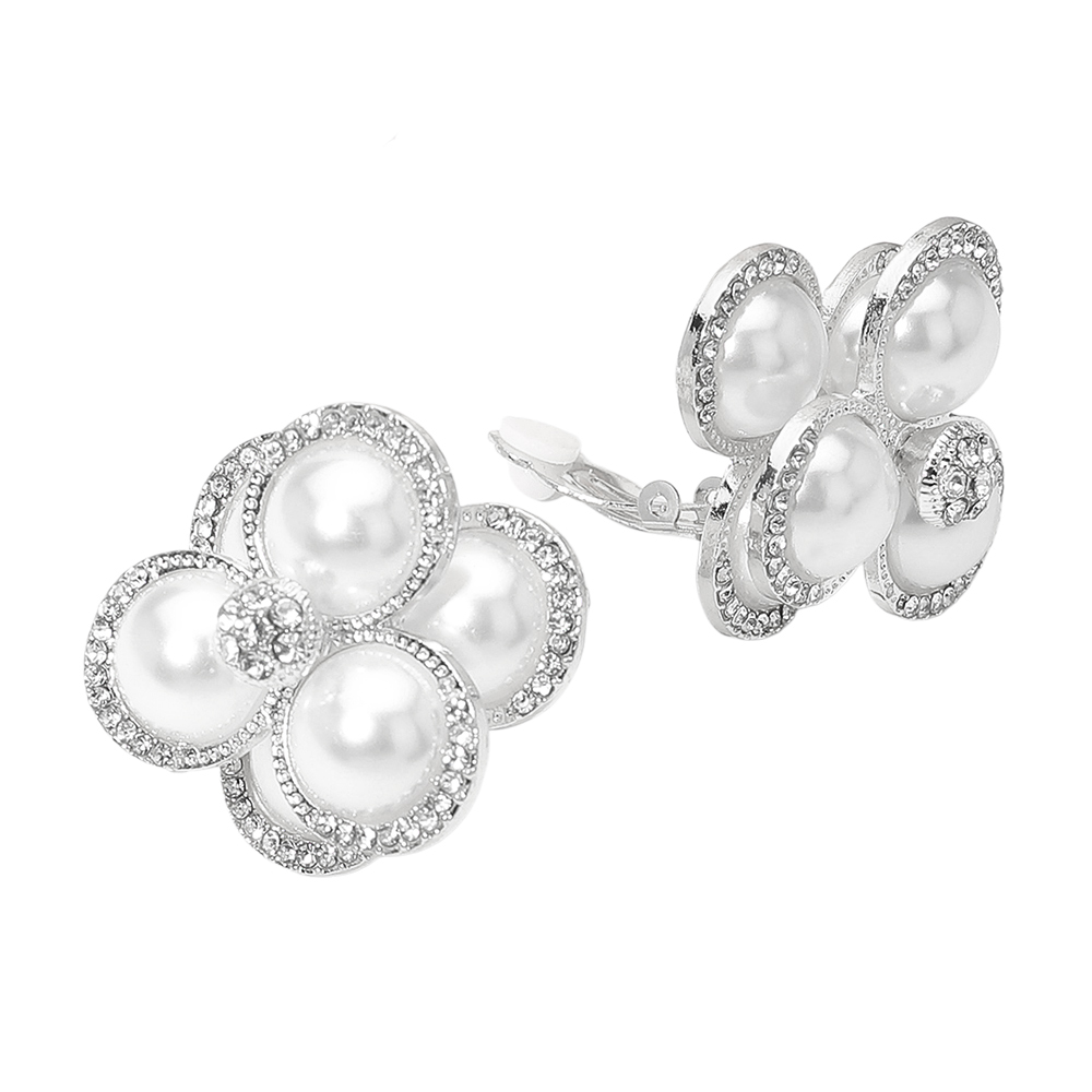 Details • Size : 1.25" X 1.25" • Clip On • Chic pearl cluster flower clip-on earrings designed with glossy petals and sparkling crystal accents. A stylish and comfortable accessory that brings an elegant touch to any outfit, perfect for both everyday wear and special occasions without the need for pierced ears. • Lead and Nickel Compliant