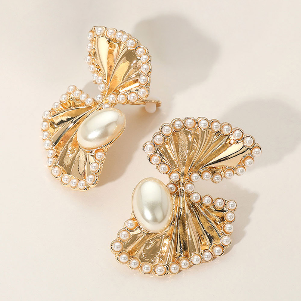 Details • Size : 1.75" X 1.75" • Clip On • Make a bold impression with these statement fan pearl clip-on earrings. Designed with sculpted fan-shaped details and a lustrous centerpiece framed by delicate accents, they exude elegance and sophistication. Perfect for elevating evening ensembles or special occasion looks. • Lead and Nickel Compliant