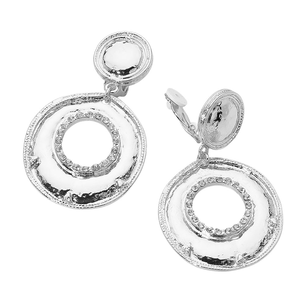 Rhinestone Accent Textured Metal Ring Drop Clip On Earrings