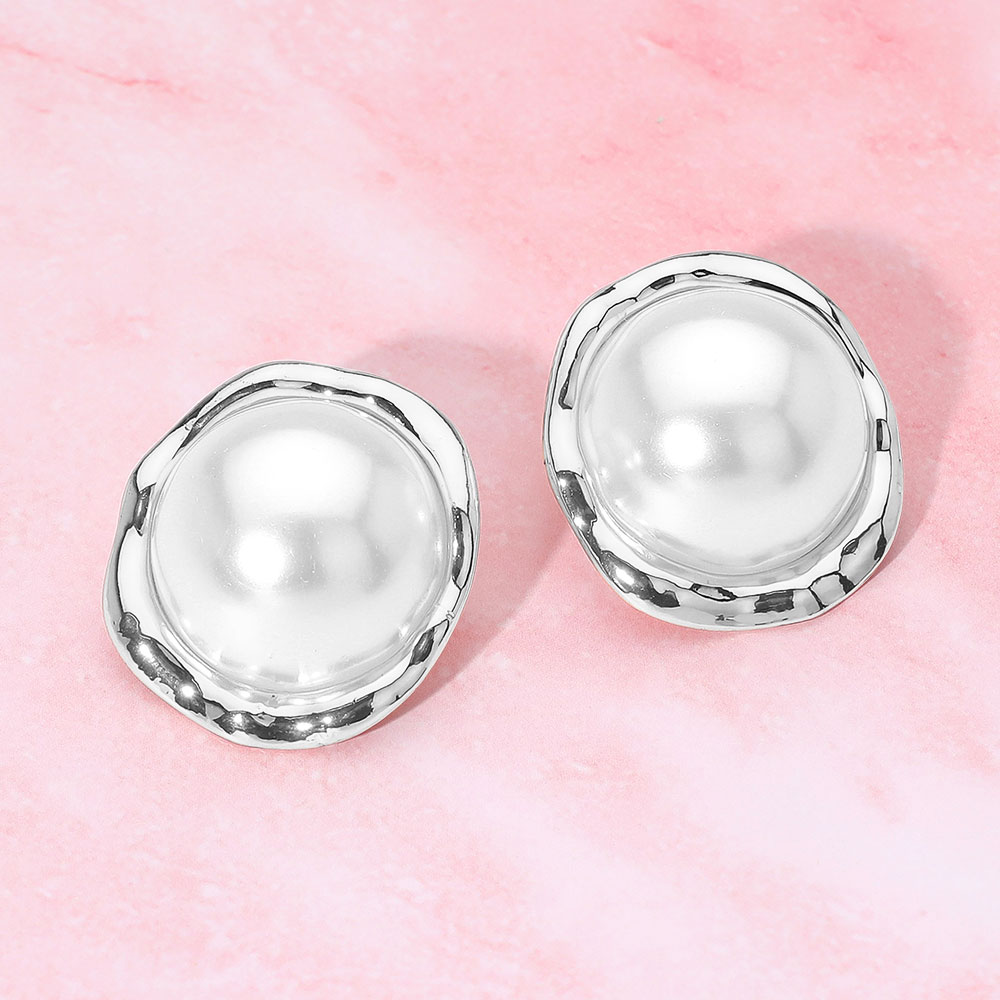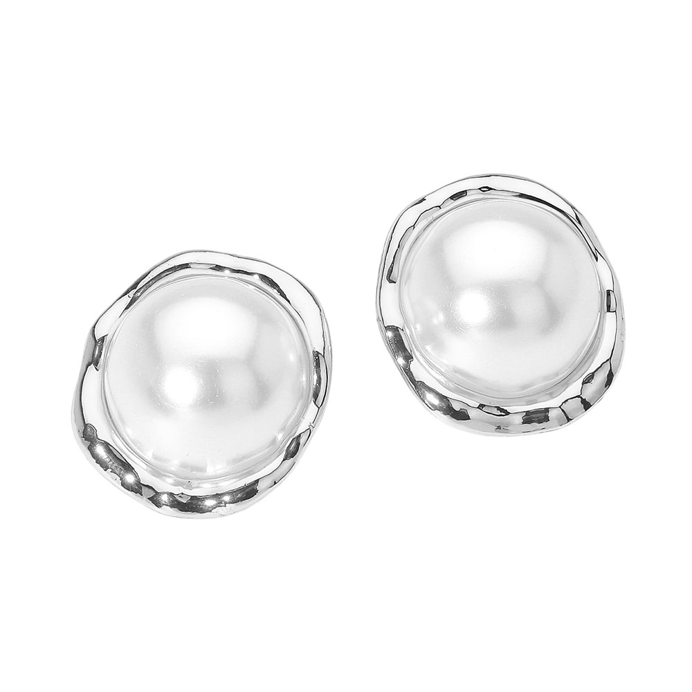 • Elegant round pearl dome clip-on earrings featuring a smooth polished center framed by an organic textured border. Designed for comfort without pierced ears, these timeless statement studs add a refined touch to both casual and dressy looks.
