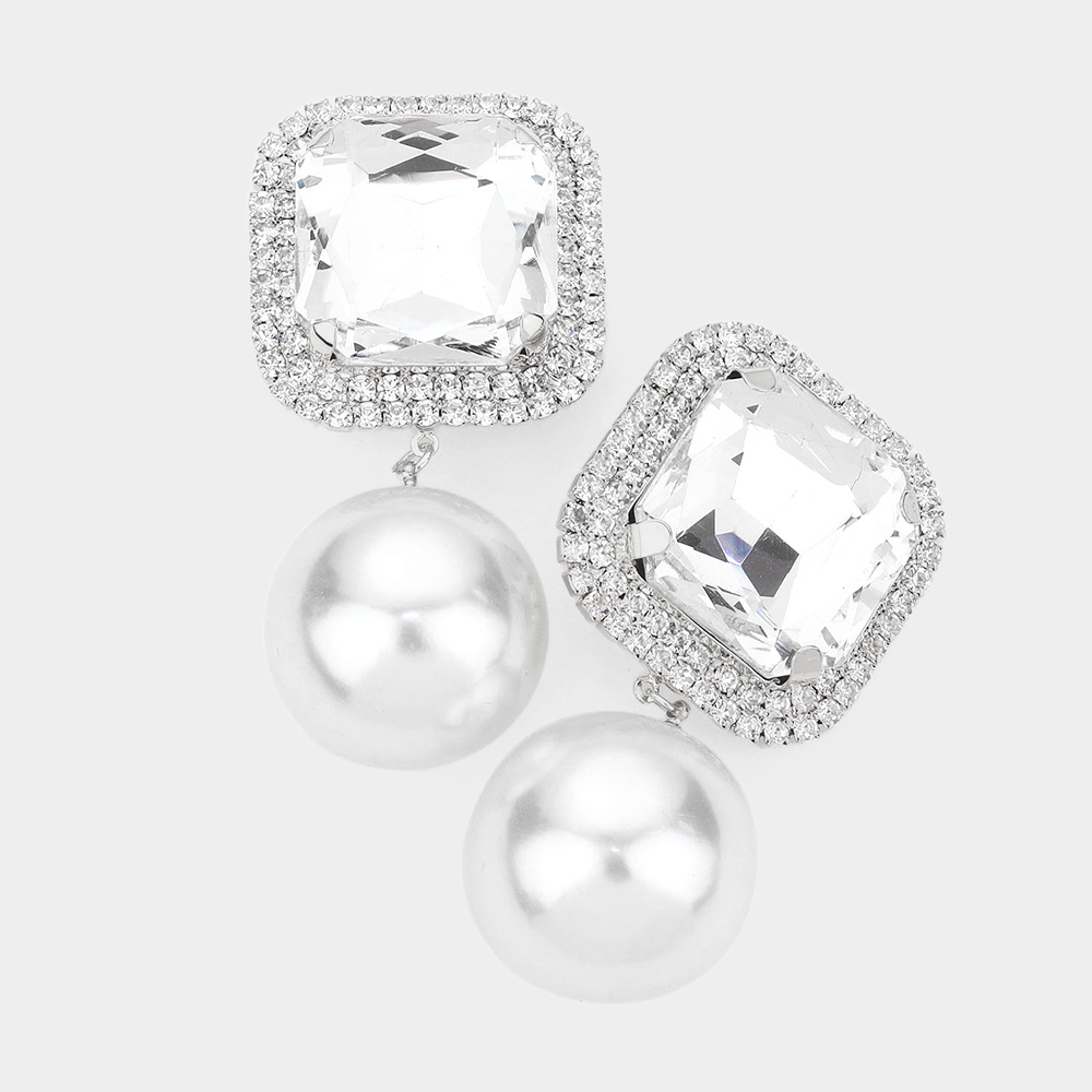 Square Stone Pearl Link Dangle Evening Clip on Earrings