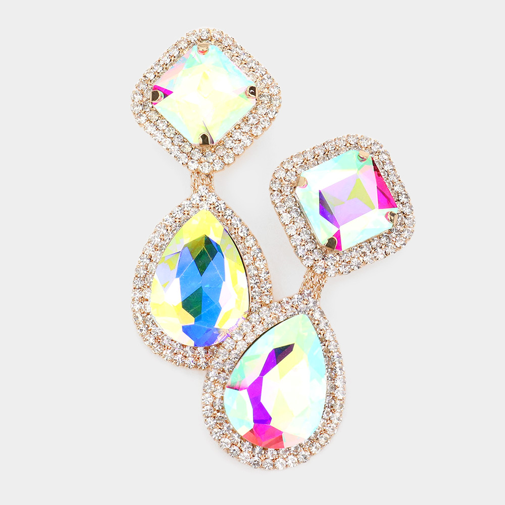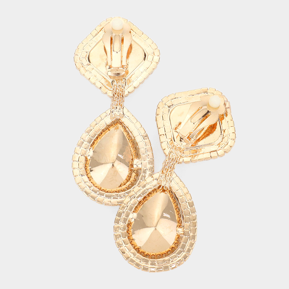 Square Teardrop Stone Accented Dangle Evening Clip on Earrings