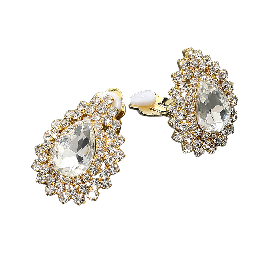 Details • Size : 0.8" X 1.2" • Clip On • Glamorous teardrop crystal cluster clip-on earrings designed with a sparkling layered halo for a radiant, eye-catching finish. Their elegant, non-pierced design offers comfortable wear for formal events, parties, bridal looks, or any occasion that calls for a touch of refined brilliance. • Lead and Nickel Compliant