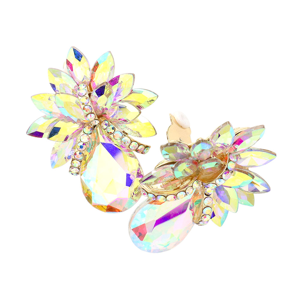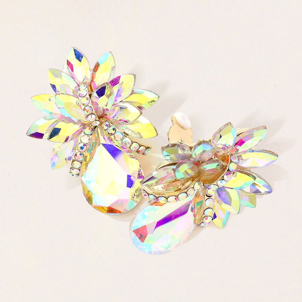 Details • Size : 1.75" X 2.25" • Clip On • Stunning clip-on earrings designed with a leaf cluster arrangement and dazzling crystal accents. These bold statement earrings add a glamorous touch to any outfit, perfect for parties, weddings, and evening events where timeless sophistication meets modern sparkle.