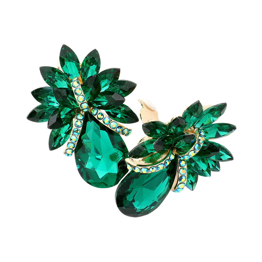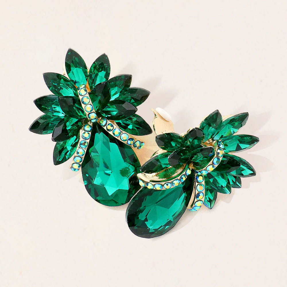 Details • Size : 1.75" X 2.25" • Clip On • Stunning clip-on earrings designed with a leaf cluster arrangement and dazzling crystal accents. These bold statement earrings add a glamorous touch to any outfit, perfect for parties, weddings, and evening events where timeless sophistication meets modern sparkle.