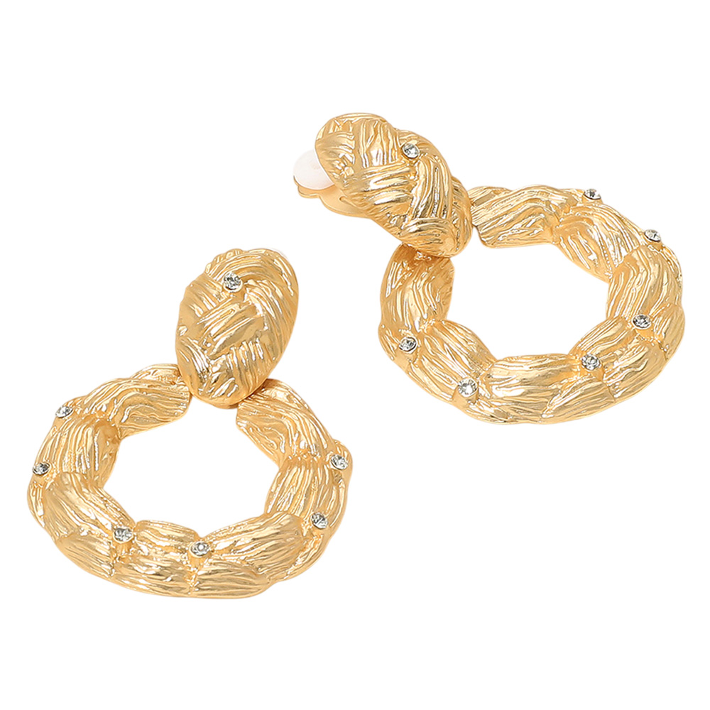 Details • Size : 1.4" X 1.8" • Clip On • Elevate your style with these textured hoop clip-on earrings featuring intricate detailing and sparkling crystal accents. Designed for comfort and elegance, they offer a bold yet versatile look perfect for both everyday wear and special occasions, without the need for pierced ears. • Lead and Nickel Compliant