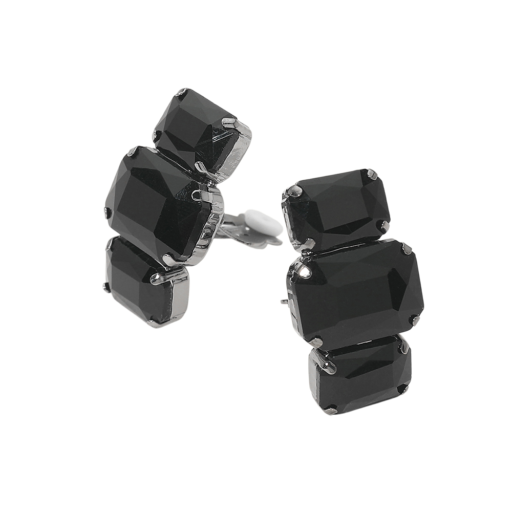 Details • Size : 0.75" X 1.25" • Clip On • Statement clip earrings designed with stacked geometric faceted stones that reflect light beautifully for a bold, eye-catching look. Perfect for dressing up everyday outfits or adding dramatic shine to evening wear, these clip earrings offer comfortable wear with a glamorous, modern silhouette that appeals to customers seeking standout accessories with elegant sparkle. • Lead and Nickel Compliant