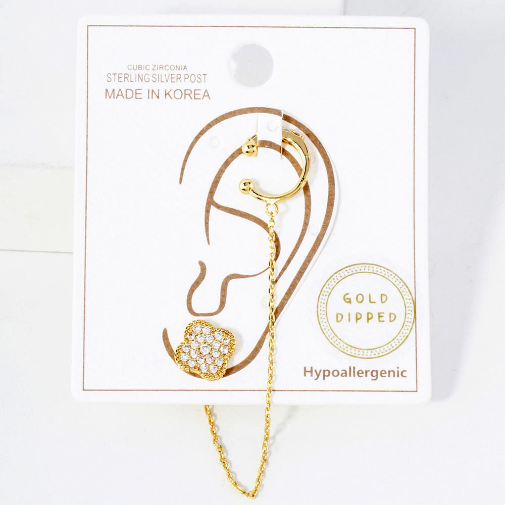 • This gold-dipped chain earring features a sparkling clover charm linked to a sleek ear cuff, offering a chic and elegant design. Adorned with cubic zirconia and crafted with hypoallergenic sterling silver posts, it’s a modern accessory perfect for effortless sophistication.