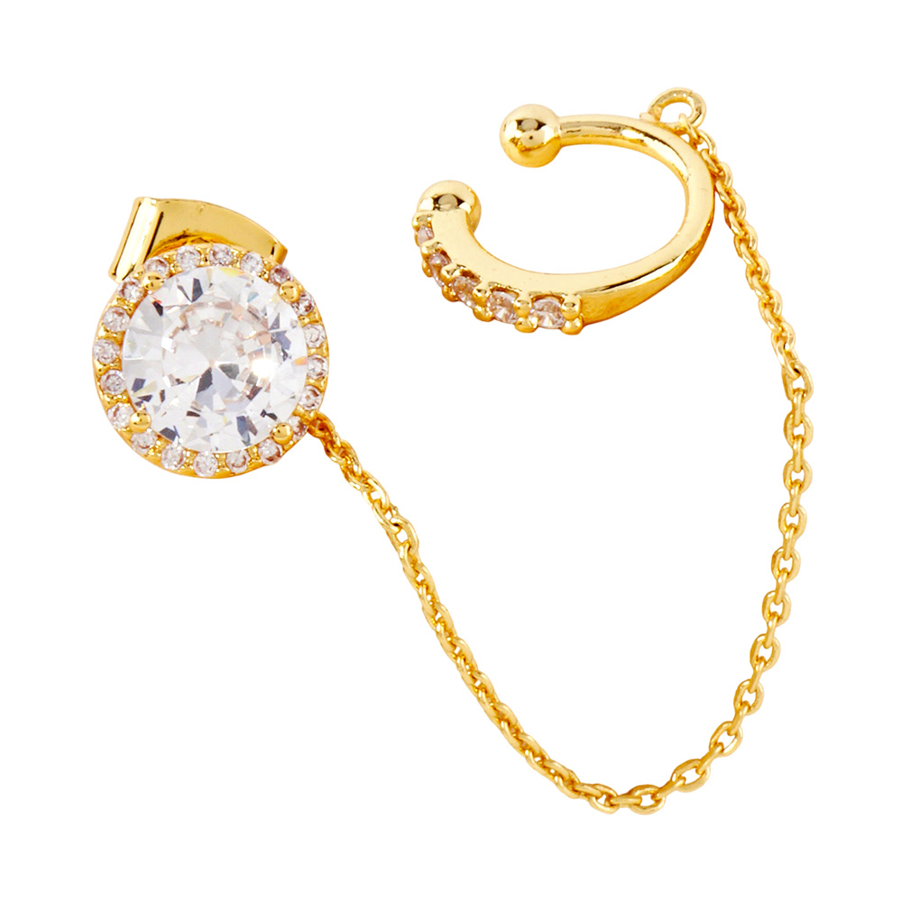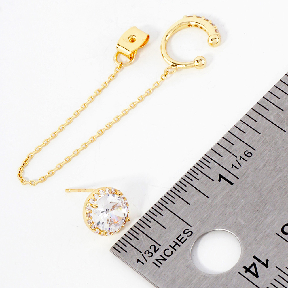 • This refined gold-dipped chain earring pairs a dazzling round cubic zirconia stud with a sleek ear cuff, joined by a delicate chain. Designed with hypoallergenic sterling silver posts, it offers a modern yet elegant statement perfect for both casual and evening wear.