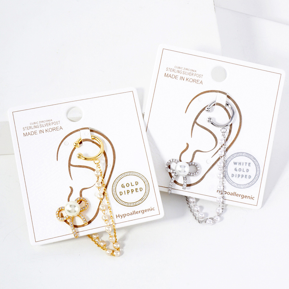 Details • Size : 1" X 2.2" • This white gold-dipped chain earring features a graceful bow adorned with cubic zirconia and a lustrous pearl centerpiece, connected to an elegant ear cuff by dual pearl-accented chains. Designed with hypoallergenic sterling silver posts, it offers a refined and feminine touch for any occasion. • Lead and Nickel Compliant • Hypoallergenic • Made In Korea • Gold Dipped • CZ Cubic Zirconia • Sterling Silver Post