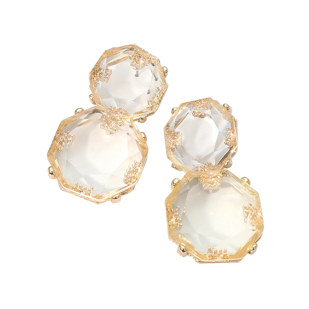 • These faceted double gem drop earrings feature a striking octagonal design that reflects light with every movement. Their elegant, layered silhouette adds a refined touch, making them a standout accessory for both casual and formal occasions.