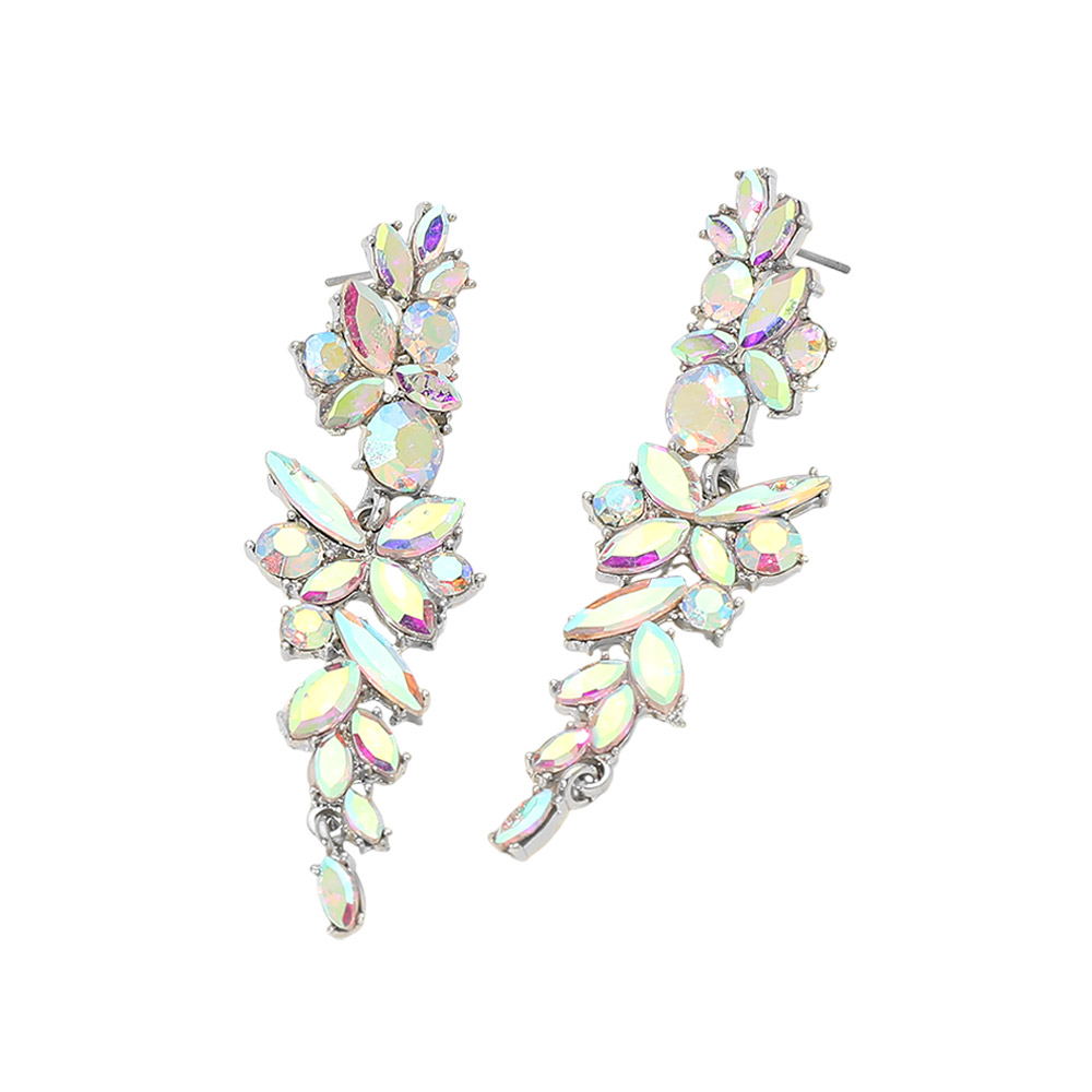 Details • Size : 0.7" X 2.4" • Post Back • These floral cluster drop statement earrings feature a cascading arrangement of faceted stones in an elegant vertical silhouette. Designed to create eye-catching movement and refined sparkle, they add dramatic impact while remaining graceful. Ideal for evening events, weddings, parties, and elevated everyday styling, making them a standout addition to any fashion jewelry collection. • Lead and Nickel Compliant