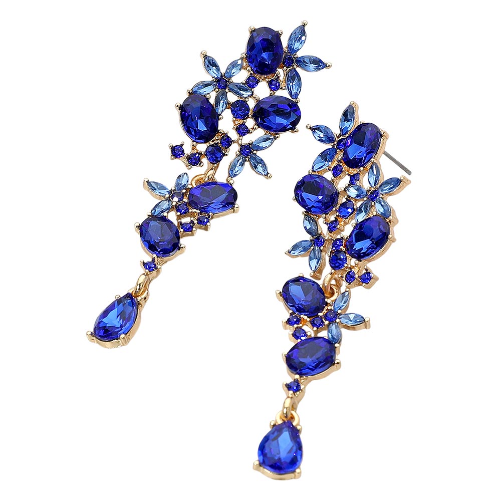 Details • Size : 0.8" X 2.7" • Post Back • These floral gem cluster drop earrings feature a graceful arrangement of marquise and oval-cut stones, creating a cascading botanical-inspired design. Perfect for evening wear or special occasions, they bring elegance and sparkle to any outfit with their intricate detailing and refined charm. • Lead and Nickel Compliant