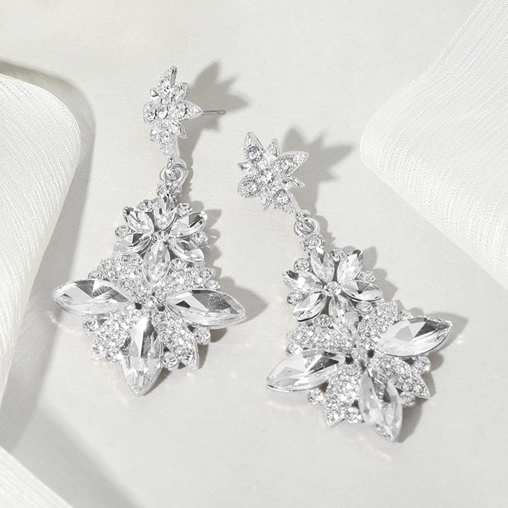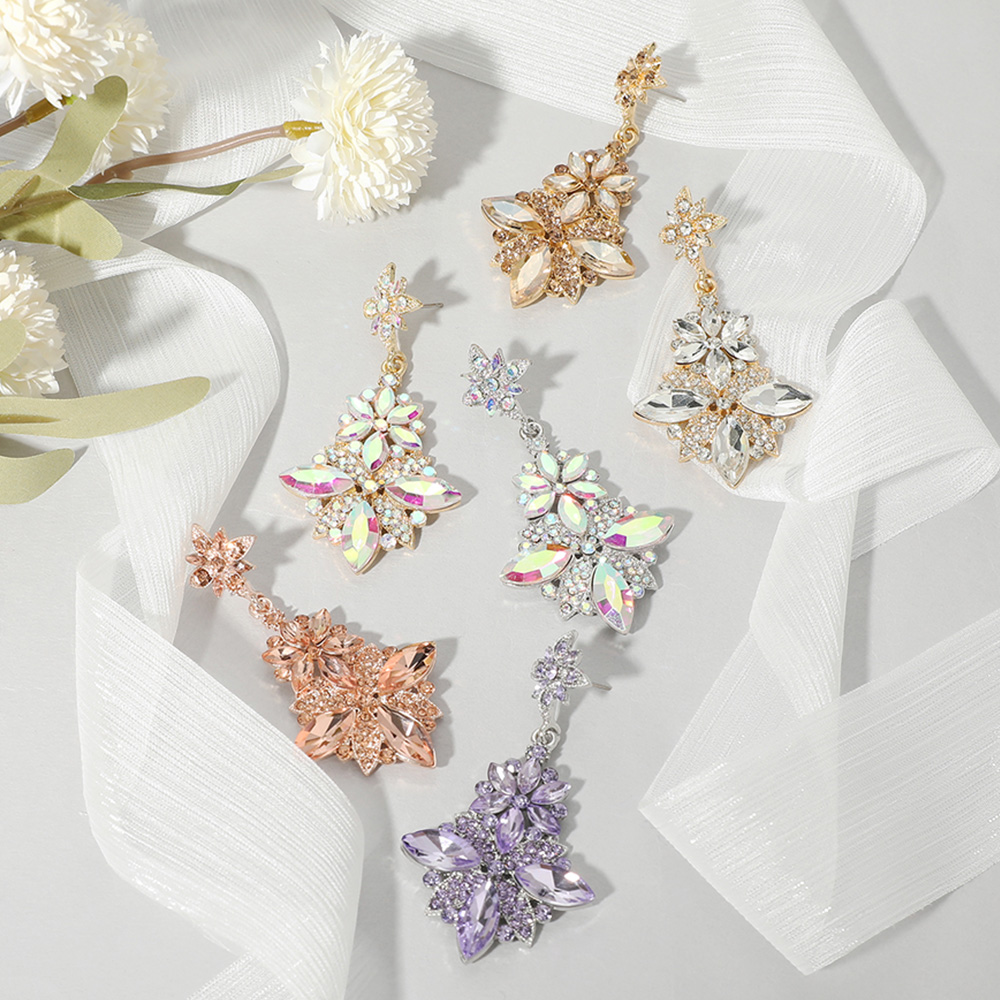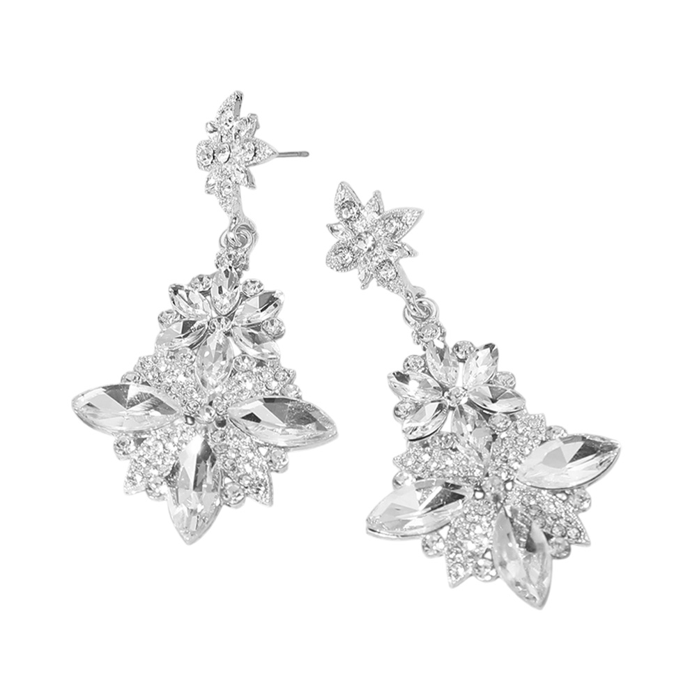 • Radiate elegance with these floral crystal drop earrings featuring a stunning cluster of faceted stones in a dazzling flower design. Ideal for weddings, galas, or celebrations, these statement earrings add a glamorous finishing touch to elevate your evening or bridal look.