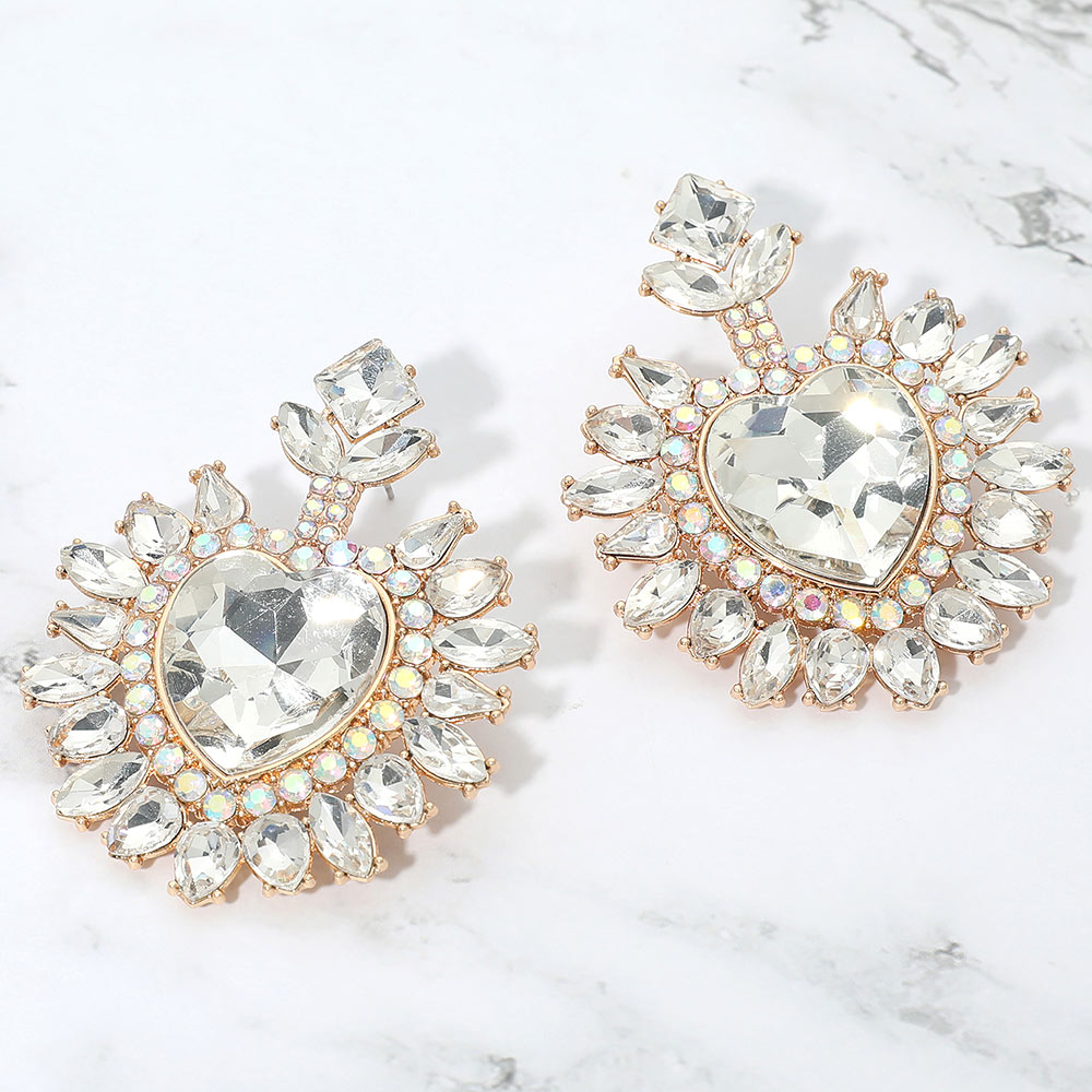 • Heart crystal statement drop earrings featuring a bold faceted center and radiant surrounding details. Designed to catch the light from every angle, this dramatic yet elegant style is perfect for special occasions, evening wear, and boutique collections seeking standout, romantic jewelry with strong visual impact.