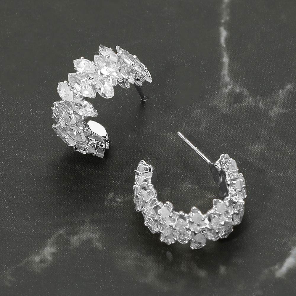 Details • Size : 1.25" X 0.75" X 0.4" • Post Back • Elegant half hoop earrings designed with closely set faceted stones that create continuous sparkle and a refined curved silhouette. These statement earrings offer a balanced blend of glamour and everyday wearability, making them ideal for dressing up casual looks or completing evening outfits with polished shine. • CZ Cubic Zirconia • Lead and Nickel Compliant