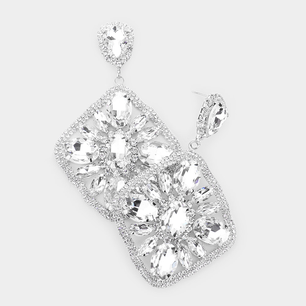 Double Rectangle Stone Cluster Pointed Rhinestone Paved Fringe Evening Earrings
