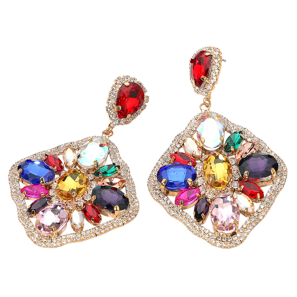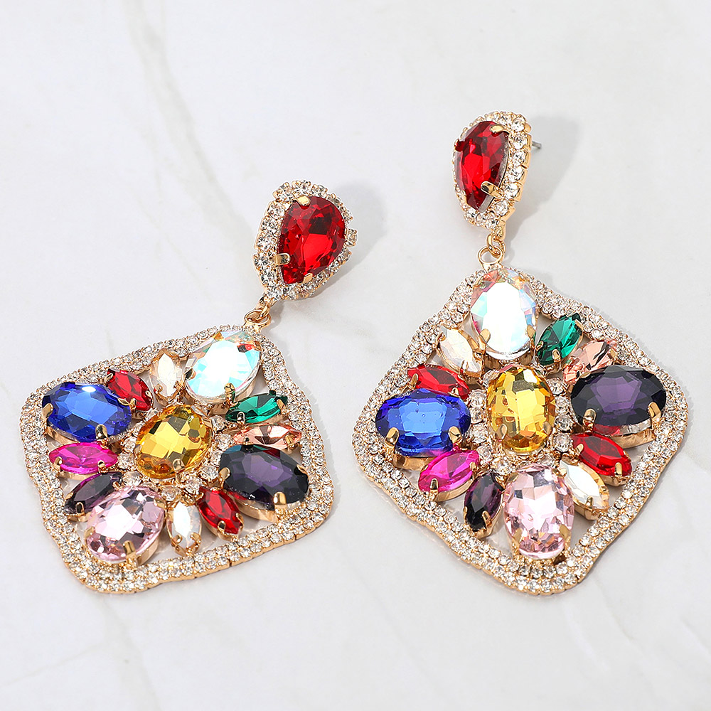 Oval Marquise Stone Cluster Accented Rhinestone Rhombus Dangle Evening Earrings