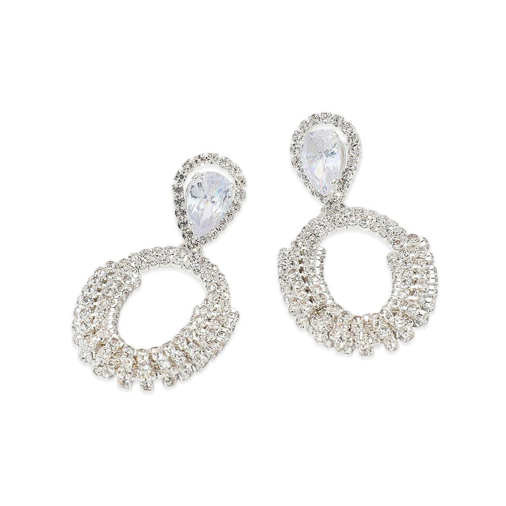 Details • Size : 1.1" X 2.2" • Post Back • Elegant statement drop earrings featuring a teardrop top paired with a circular halo design for elevated sparkle and movement. Designed to stand out at weddings, parties, and formal events, these eye-catching earrings add refined glamour and modern appeal to any curated jewelry collection or boutique display. • Lead and Nickel Compliant