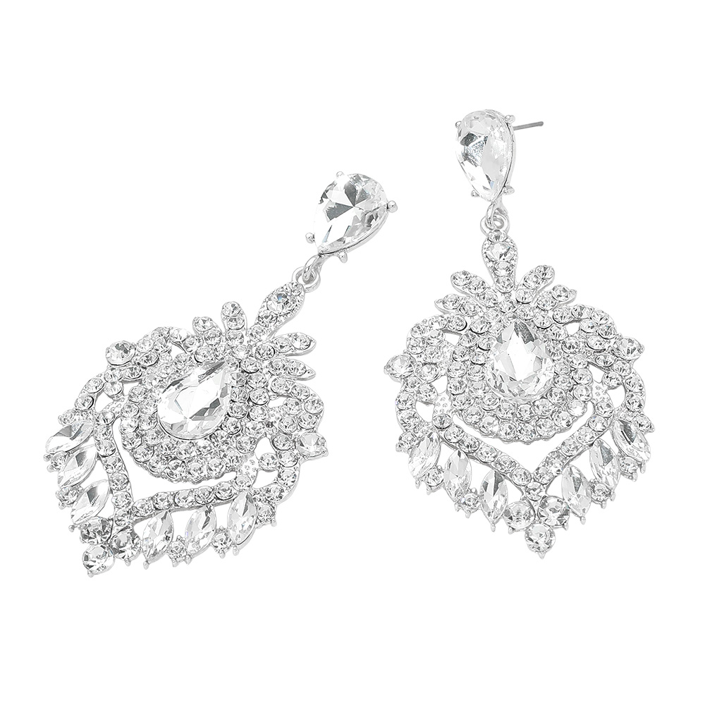 • These statement crystal drop chandelier earrings feature an intricate layered design with faceted accents that catch the light from every angle. Designed to elevate evening looks, weddings, and special events, they add bold sparkle and refined glamour while remaining comfortable to wear. A striking accessory that instantly enhances dresses, formal outfits, or party-ready styles.