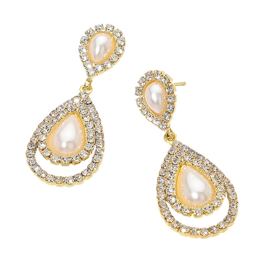 Teardrop Pearl Accent Rhinestone Pave Trim Drop Evening Earrings